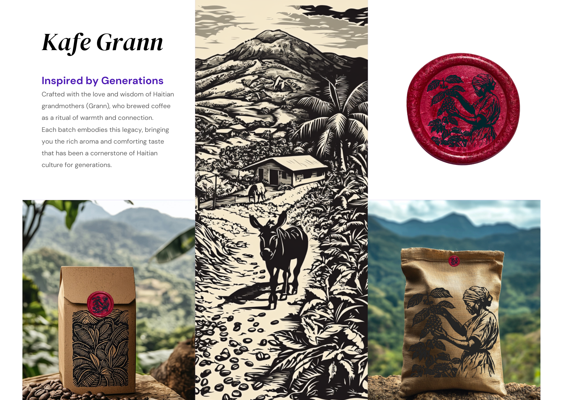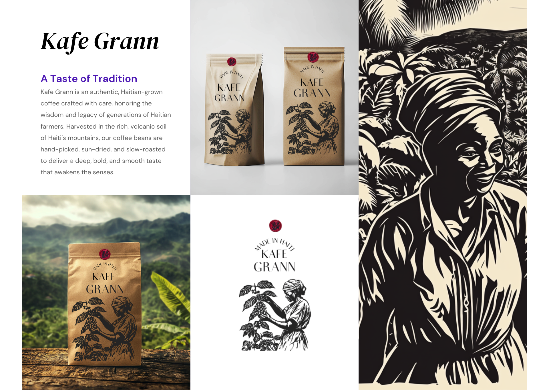 I was contracted to design the logo and brand identity for Kafe Grann, a Haitian coffee brand. Using AI-assisted image generation, I created visuals inspired by Haitian farming traditions, then refined the artwork using my graphic design skills to develop packaging, logo elements, and a cohesive brand strategy rooted in authenticity and cultural pride.