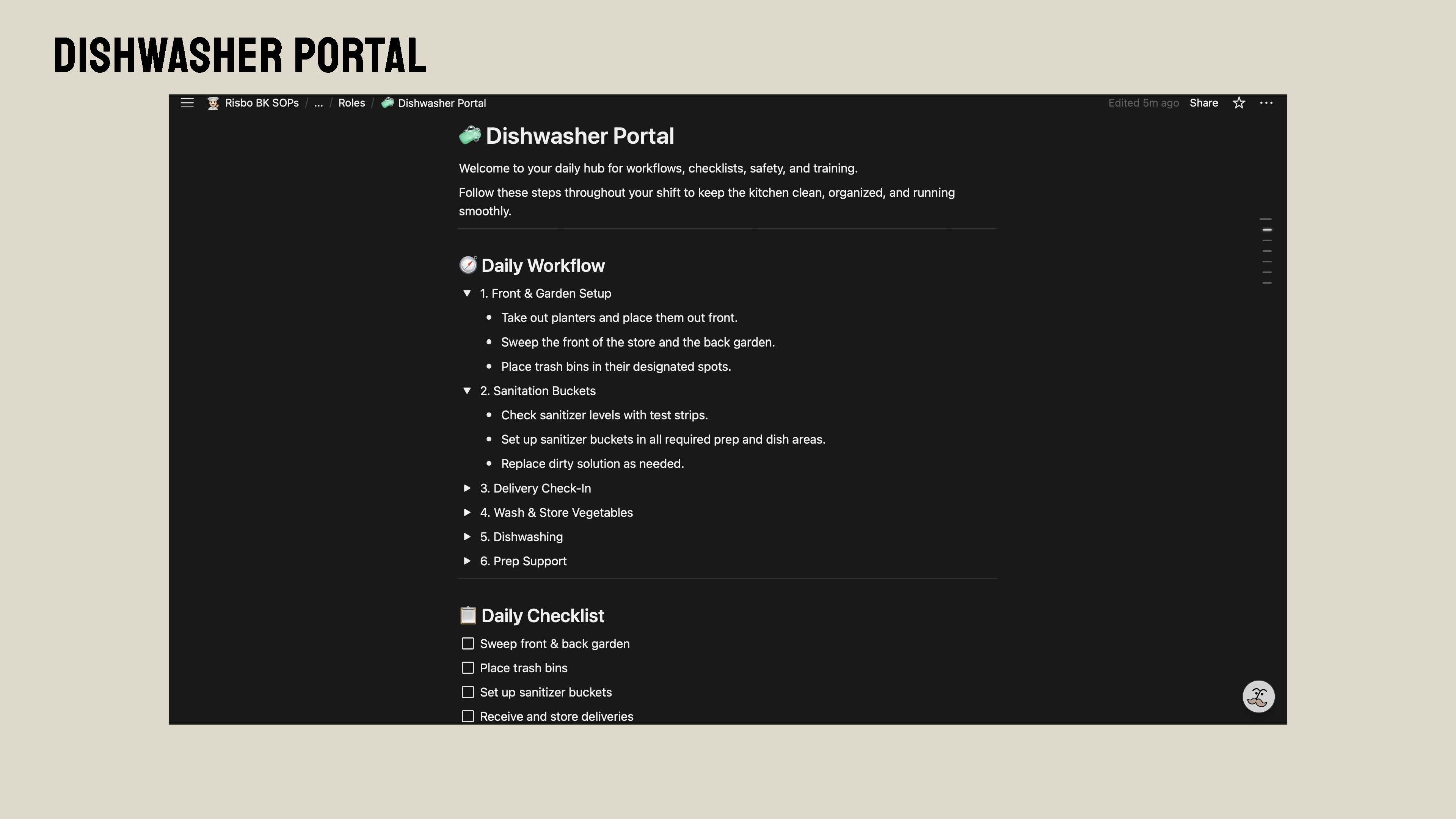 Architected the system and led front-end development in React, working alongside a backend developer using Node.js and SQL. I designed the workflow from the ground up, beginning with a Notion proof of concept and evolving it into a production-ready application. I also worked directly with management to organize SOP content and collaborated with a videographer to create training materials.
